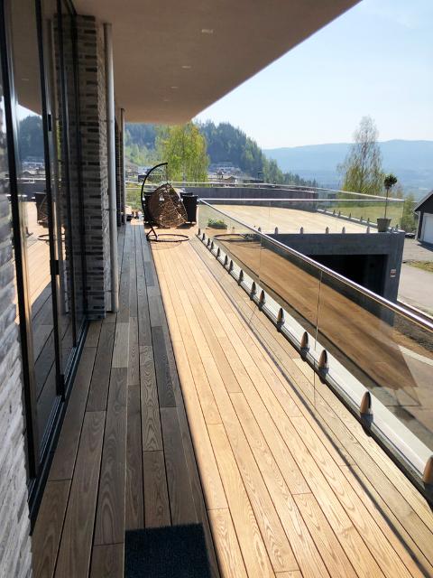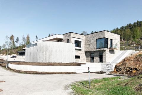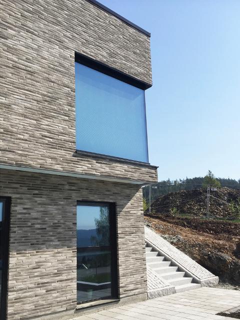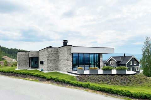 Moderne og innholdsrik enebolig med fasader i tegl og betong. Bygningskroppen følger eiendommens kurvatur og holder en lav profil mot åsryggen til nordøst. Store glasspartier i fasadene trekker utsikt og lys inn i boligen.